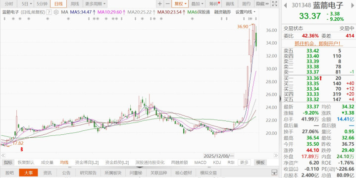 格隆汇1月22日|蓝箭电子(301348.SZ)跌9.2%,报33.37元,总市值80.09亿元;此前13个交易日(1月5日-21日),该股累计涨幅超82%。蓝箭电子公告称,股东银圣宇于2026年1月16日至2026年1月20日通过大宗交易方式减持公司股份239.95万股,占公司总股本的1.00%。本次权益变动后,银圣宇目前持有公司股份1199.99万股,占公司总股本的5.00%。本次减持股份来源为首次公开发行前取得的股份及资本公积转增股本获得的股份,减持原因为自身资金需要。(格隆汇)